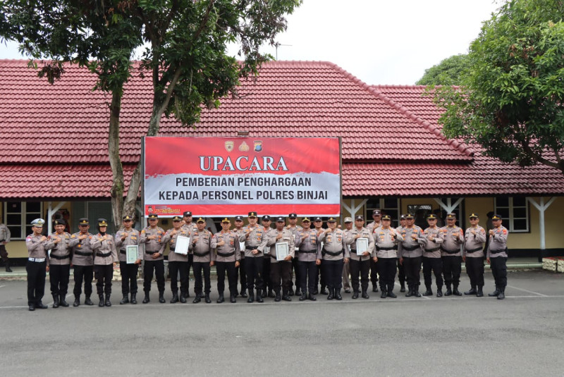Binjai,Wahananews.co | Kapolres Binjai AKBP Bambang C. Utomo, S.H., S.I.K., M.Si., berikan reward atau penghargaan terhadap personil sat Binmas Polres Binjai, di lapangan apel polres Binjai jalan sultan hasanuddin No.1 Binjai, provinsi sumatera utara, Jumat (17/10/25).